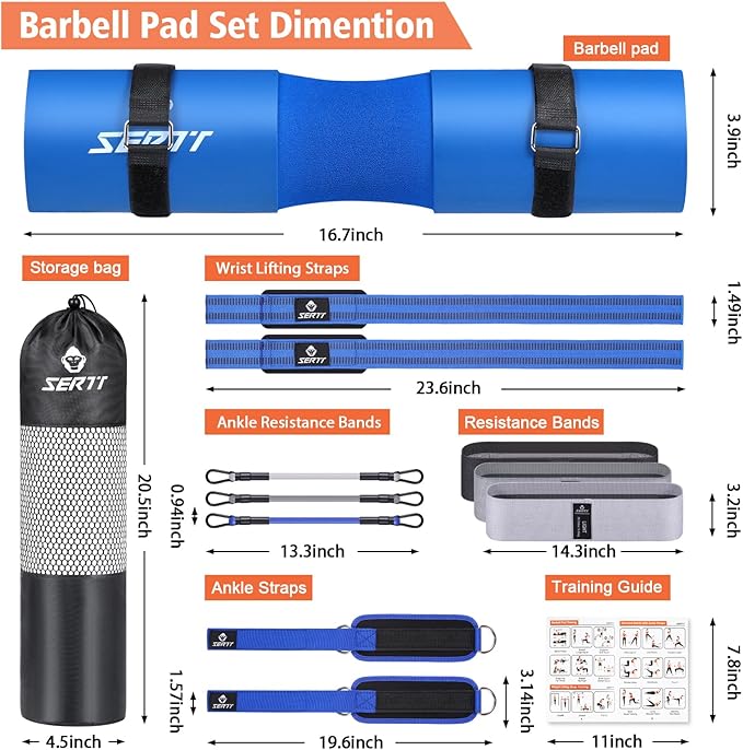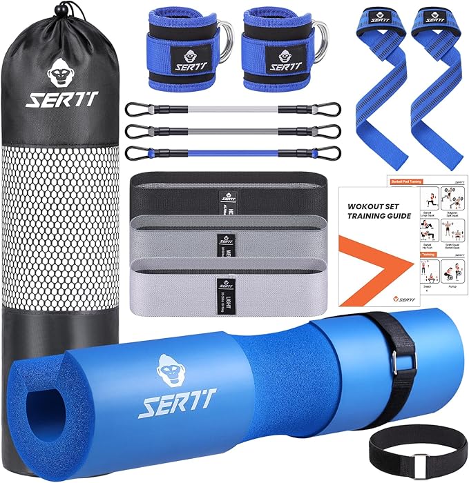 - All-in-One Gym Kit: SERTT gym kit includes 1* Barbell Pad with Drawstring Bag, 2* Weight Lifting Straps, 2* Ankle Cuffs, 3* Ankle Risistance Band, 3* Hip Resistance Band. Perfect for all fitness levels, whether you're a beginner or an experienced gym enthusiast, women or men, this barbell pad set is a must-have gym accessories for your fitness routine.