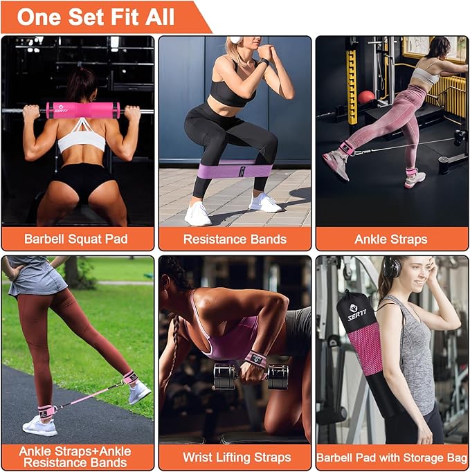 - All-in-One Gym Kit: SERTT gym kit includes 1* Barbell Pad with Drawstring Bag, 2* Weight Lifting Straps, 2* Ankle Cuffs, 3* Ankle Risistance Band, 3* Hip Resistance Band. Perfect for all fitness levels, whether you're a beginner or an experienced gym enthusiast, women or men, this barbell pad set is a must-have gym accessories for your fitness routine.