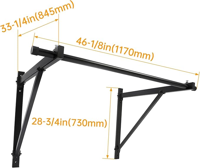 - Bracket Height: 28-3/4 inch, Bracket Depth: 33-1/4 inch, Bar length: 46-1/8 inch,Bar diameter: 1-1/4 inch. You can use our heavy duty Pull Up Bar to dress your home as a gym, and you can exercise freely even at home. It can be installed vertically or horizontally, and the height can be installed according to your needs.