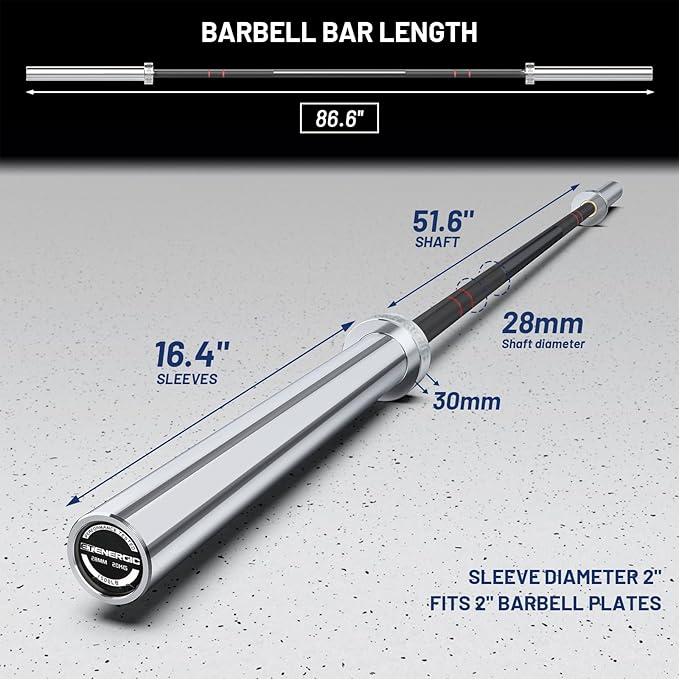 - [Spec] Our barbell bar adopts refined design to meet your every strength training. The bar weighs 44 pounds (20 kg) and is 86.61 inches (7-foot) long. The length of the sleeve that can be loaded is 16.4 inches, suitable for a 2-inch barbell. The medium knurled design of 28mm satisfies your picky details. Is your high-quality choice for training