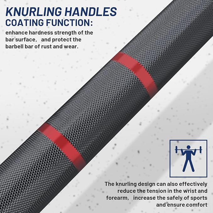 - [Medium Barbell Knurling] The 28mm grip shaft with a 1.2mm medium-level knurling, and have a moderate whip, increases friction and improves the grip experience. The knurling design can also effectively reduce the tension in the wrist and forearm, increase the safety of sports and ensure comfort