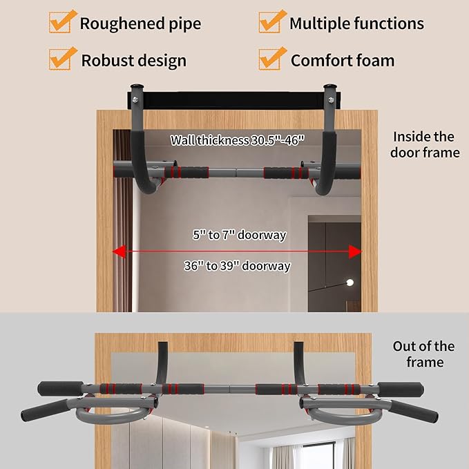 - 💪 EASY TO INSTALL & PORTABLE DESIGN: The adjustable, portable design of this pull-up bar makes it easy to install and assemble on any standard 30" to 32" doorway. And, it can be easily stored when not in use, making it perfect for home or office use.