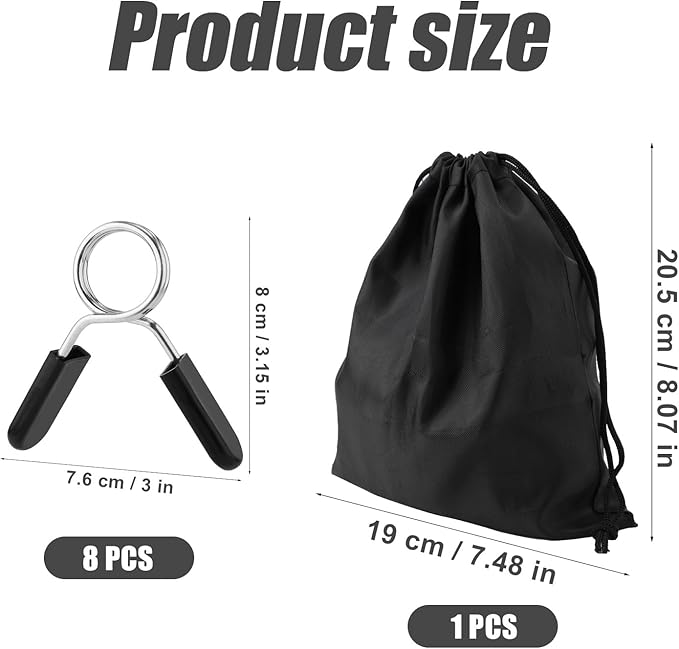 - Product Size: The size barbell clip is about 8x7.6cm/3.15x3in and its inner diameter is 2.47cm/0.97in; the storage bag is about 20.5x19cm/8.07x7.48in.
