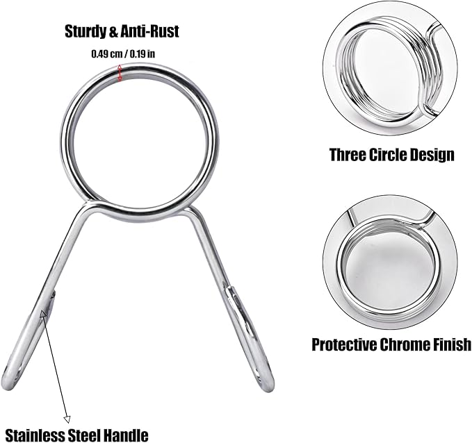 - Heavy Duty: Made of chrome-plated steel designed with 3 circle springs, the weight clips can hold weight plates in place to prevent sliding off or moving around from the barbell.