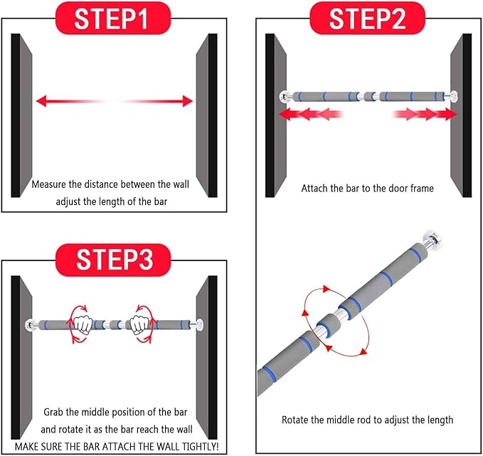 - EASY INSTALLATION, Super easy to install which you can do in minutes! Just rotate the ends to extend them, make sure the extension on each side has the same legnth. Rotate the bar bit hard to fasten;