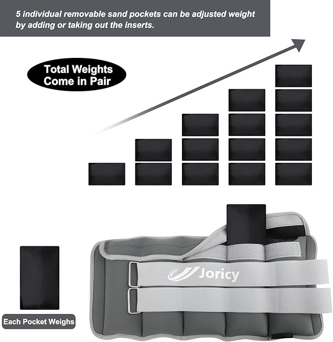 - Adjustable Ankle Wrist Arm Leg Weights: 5 individual removable sand pockets for each hand weights for walking, each pocket weighs 1.2 lbs, total weights of a pair (each ankle weights for women 6lbs each) can be adjusted from 1-12 lbs by adding or taking out the inserts.