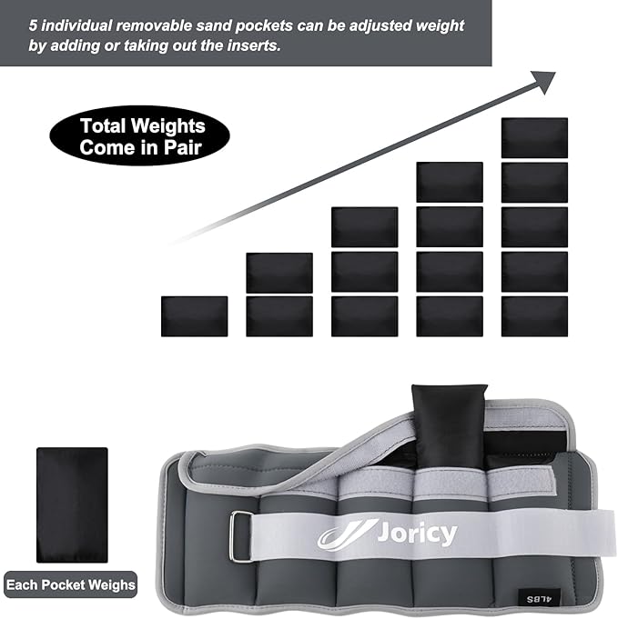 - 3 lbs Ankle Weights Pair: 5 individual removable sand pockets for each ankle/wrist weights, each pocket weighs 0.3 lbs, total weights of a pair (each 1.5 lb ankle weights) can be adjusted from 1-3 lbs by adding or taking out the inserts.