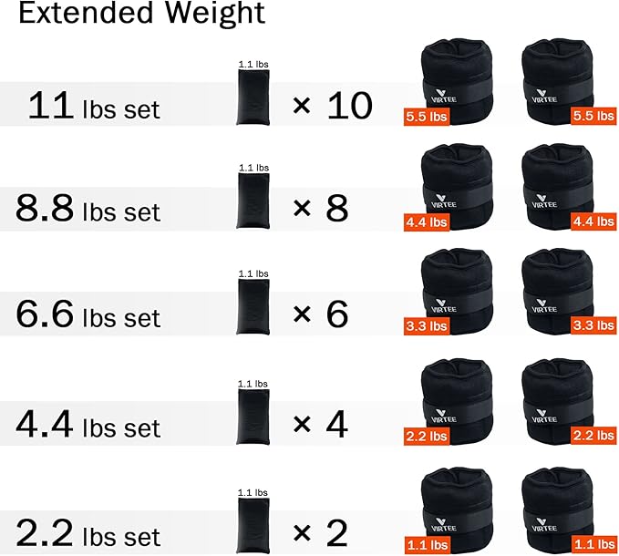 - FULLY ADJUSTABLE WEIGHTS: 5 removable sandbags for each ankle weights, each sandbag weighs 1.1 lbs, can easily be added or removed from 1.1 lb to 11 lbs pair.