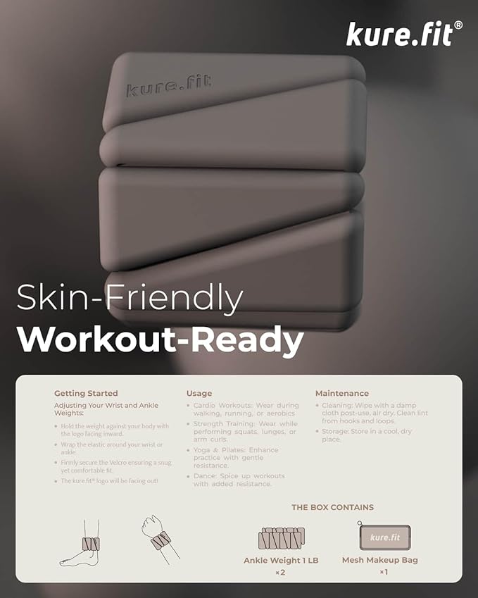 - Style : Welcome to kure.fit, where every piece of our fitness gear is a blend of practical elegance and contemporary design! Experience the epitome of style-conscious modern aesthetics with our Adjustable Wrist & Ankle Weights Set. Designed not just for function but also for fashion, these weights are the ultimate workout accessories for those who value trendsetting style alongside their fitness goals. Fashionable and chic, these wearable bracelets enhance your fitness regimen while showcasing elegant durability and a sleek, functional design. Ideal for a variety of activities—from Yoga and Pilates to running and aerobics—these 1lb pairs are a testament to fashionable fitness. Embrace this essential piece of exercise gear that perfectly marries durability with a chic, contemporary look. Join us at kure.fit and make a statement with every workout. Elevate your fitness experience with our weights that promise not just to meet, but to exceed your expectations in both style and performance. Step into your fitness journey with confidence and grace, sporting the most stylish and practical fitness gear on the market. Welcome to kure.fit, where every piece of our fitness gear is a blend of practical elegance and contemporary design! Experience the epitome of style-conscious modern aesth… See more