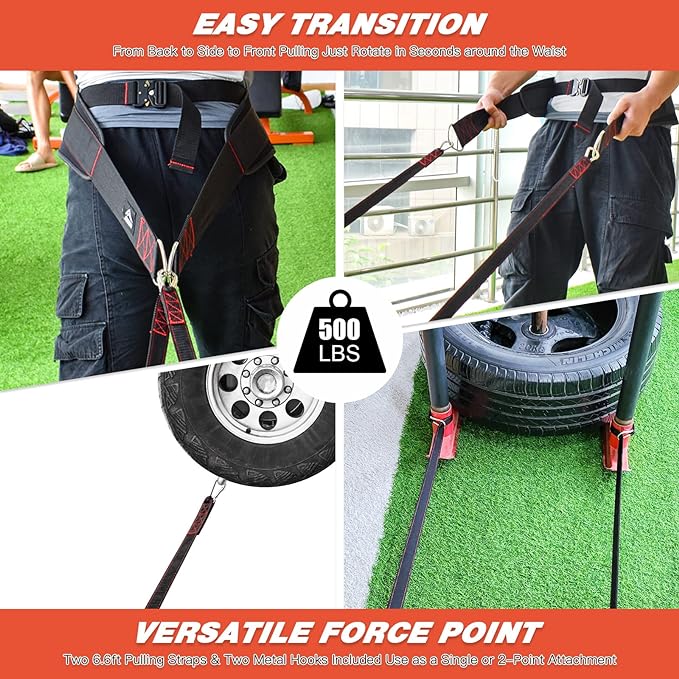 - 🏃♂️ Easy Transition Universal Size Sled Belt: Easily Rotate Around The Waist For Changing Pulling Direction,From Back to Side to Front Pulling Just Rotate in Seconds around the Waist,Adjustable Waist Strap With Lots Of Adjustment Room Both Ways, From the Smallest Waist (25in/64cm) to the Biggest (42in/107cm )