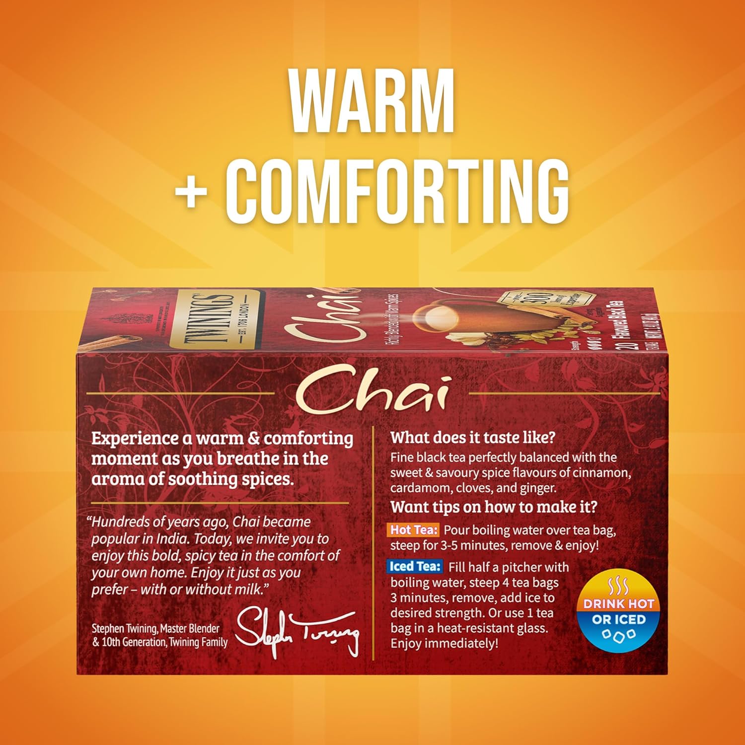 Twinings Chai Black Tea Individually Wrapped Bags, 20 Count (Pack of 6), Sweet, Savoury Spices, Caffeinated, Enjoy Hot or Iced, 120 Teabags