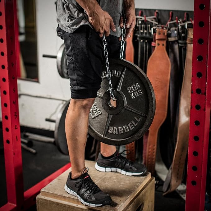 - 30-inch steel chain and carabiner mechanism to easily add weight for chin-ups and dips