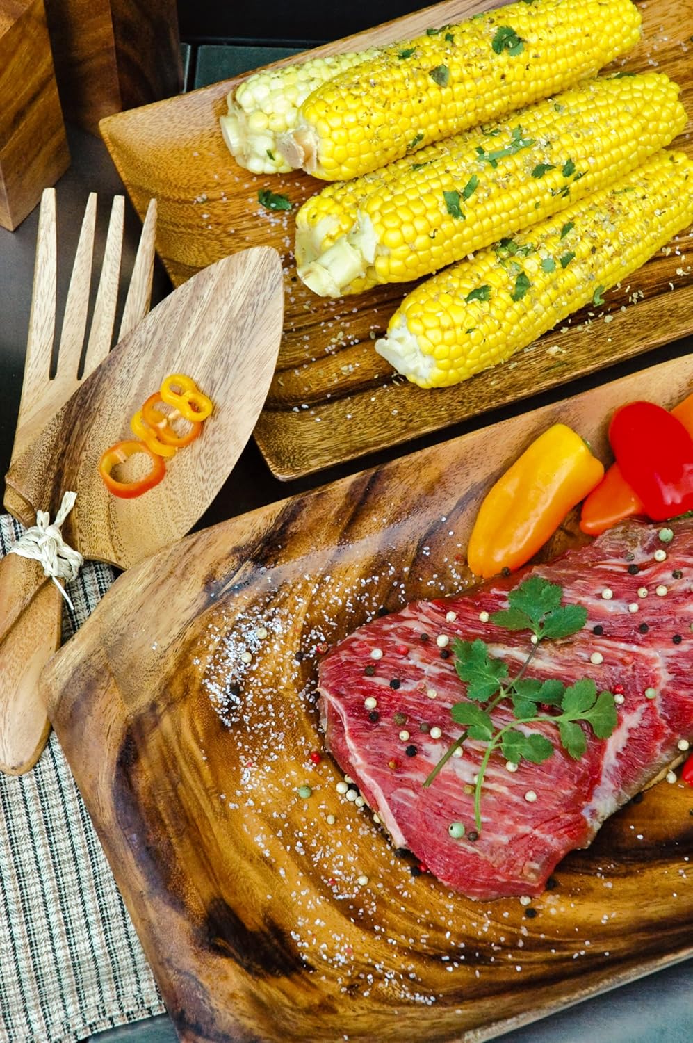 - Durable, resinous acacia hardwood with rich color and prominent grain
