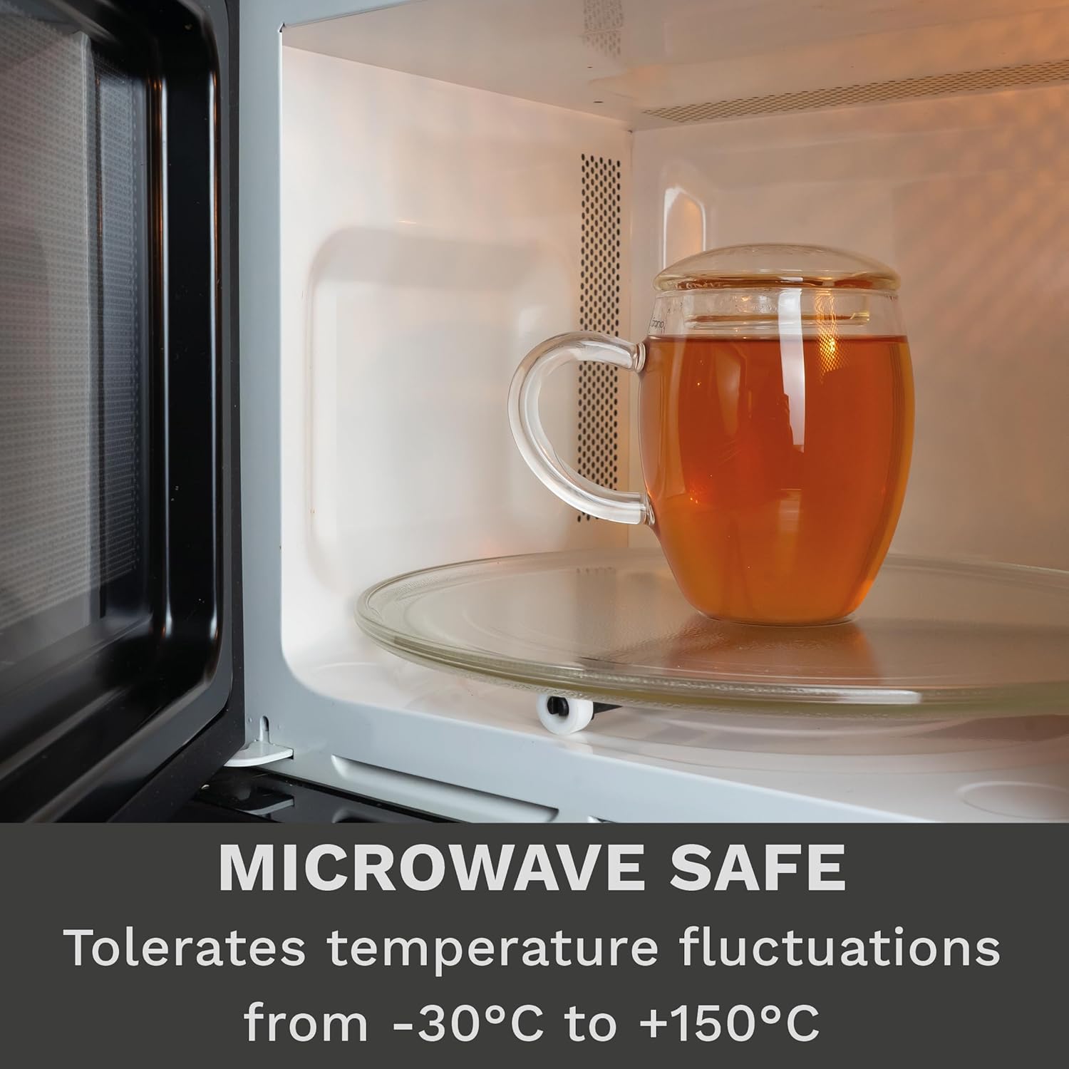 - OFFER: 1x 14oz (400ml) infusion mug with lid, handle, and filter lid made of clear high quality borosilicate glass, which keeps hot drinks warm a little longer. The all-in-one tea glass is made for the enjoyment of high quality tea of all kinds such as loose tea, fruit tea, green tea, black tea and tea bags. Delivered in a high-quality gift box.