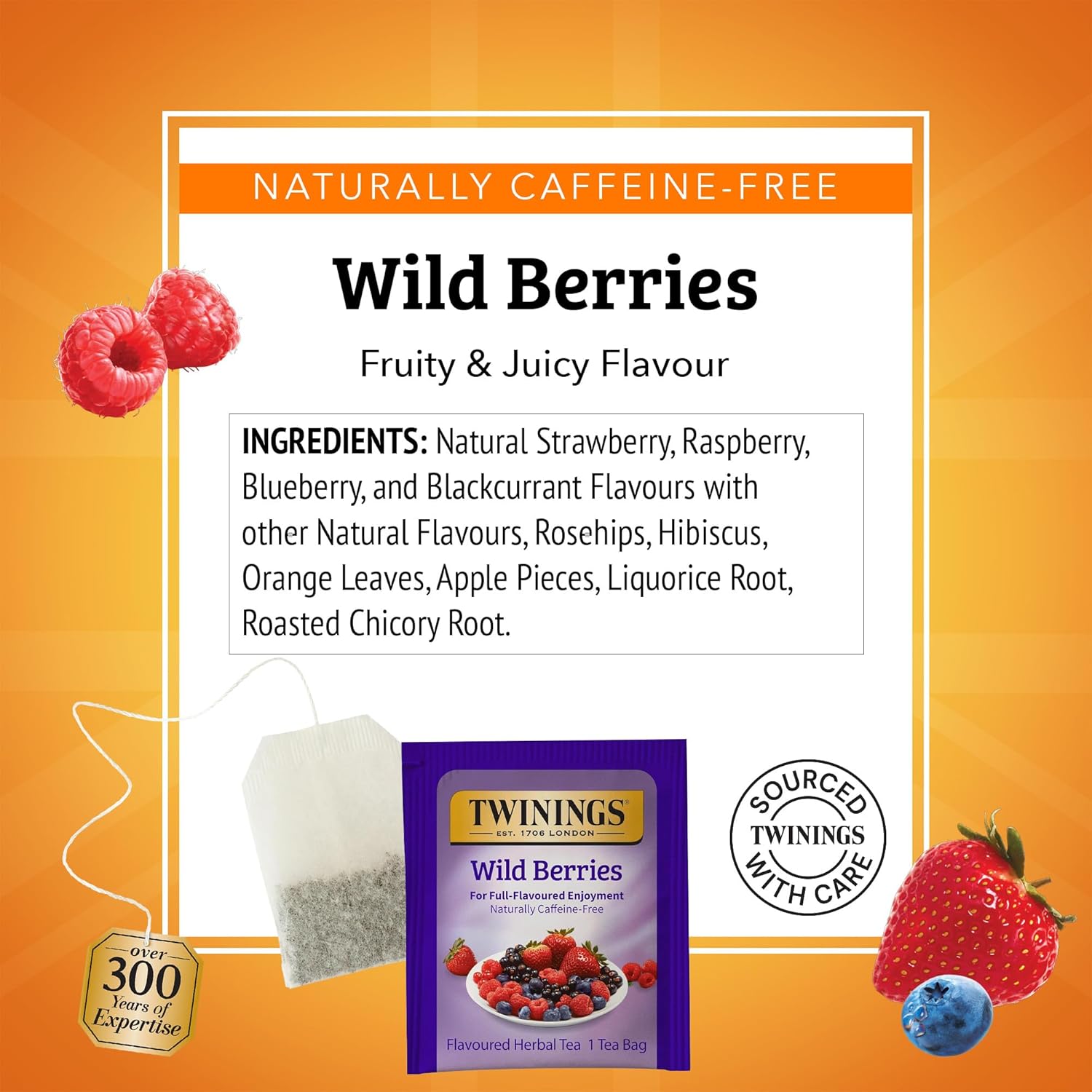 - Twinings Wild Berries Herbal Tea, 20 Count Pack of 6, Individually Wrapped Tea Bags, Full-Flavoured, Naturally Caffeine Free