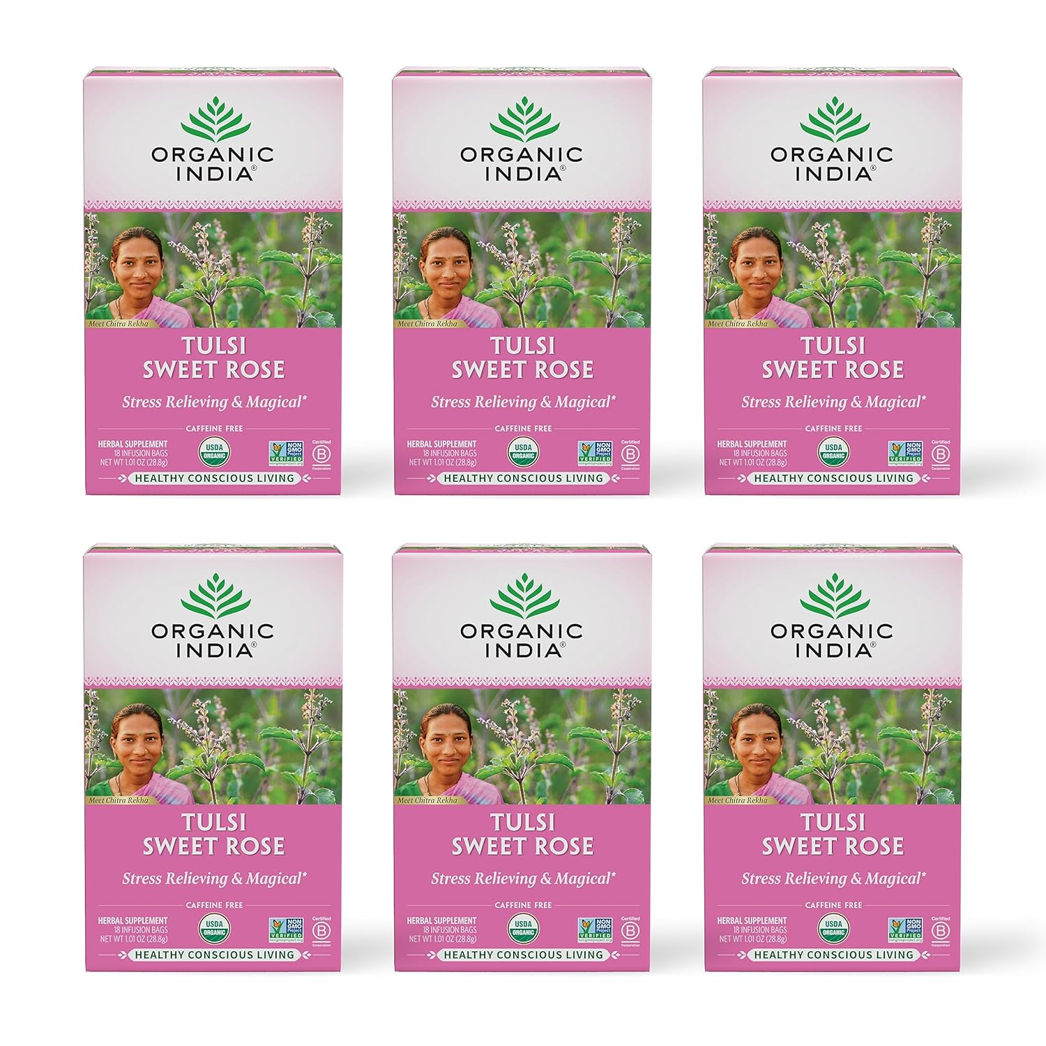 Organic India Tulsi Sweet Rose Herbal Tea - Holy Basil Leaf, African Basil, Chamomilie, Lemon Myrtle, Stress Relieving, Immune Support, USDA Certified Organic, Caffeine-Free - 18 Infusion Bags, 6 Pack