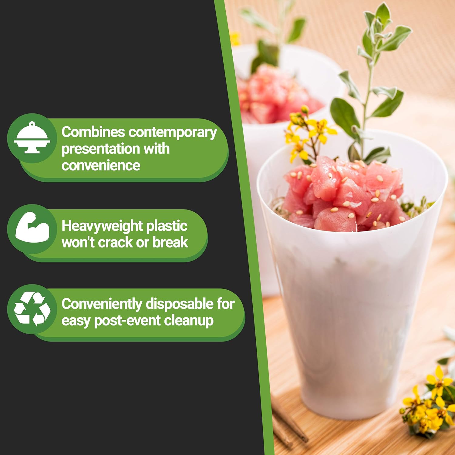 - 100 INCLINE BOWLS PER ORDER: Measuring 3 inches in length by 3 inches in width by 4 inches in height, these disposable dessert cups hold up to 7 ounces. You'll receive 100 bowls per order.