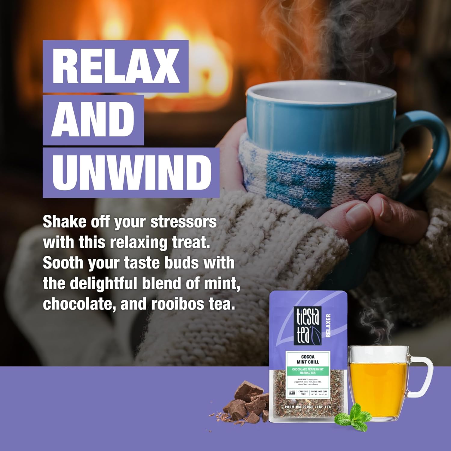 - DELICIOUS CHOCOLATE PEPPERMINT FLAVOR: Indulge in the delightful blend of chocolate and peppermint with Tiesta Tea’s Cocoa Mint Chill. This caffeine-free tea is perfect for unwinding or enjoying a sweet treat at any time of day. Whether served hot or iced, it offers a refreshing and soothing experience.