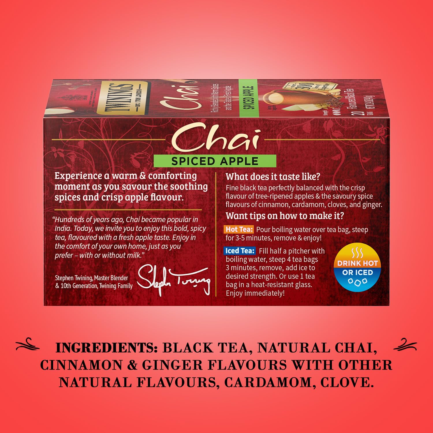 - AROMATIC APPLE CHAI: Finest black tea expertly blended with crisp flavour of tree-ripened apples and the savoury spice of cinnamon, cardamom, cloves and ginger wil delight your senses; Caffeinated, 20 Count, Pack of 1