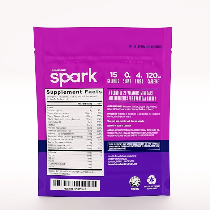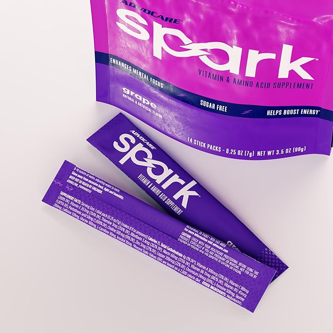 AdvoCare Spark Vitamin & Amino Acid Supplement - Focus & Energy Drink Powder Mix with Vitamin A, B-6, C & E - Also Includes L-Carnitine & L-Tyrosine - Grape, 14 Stick Packs