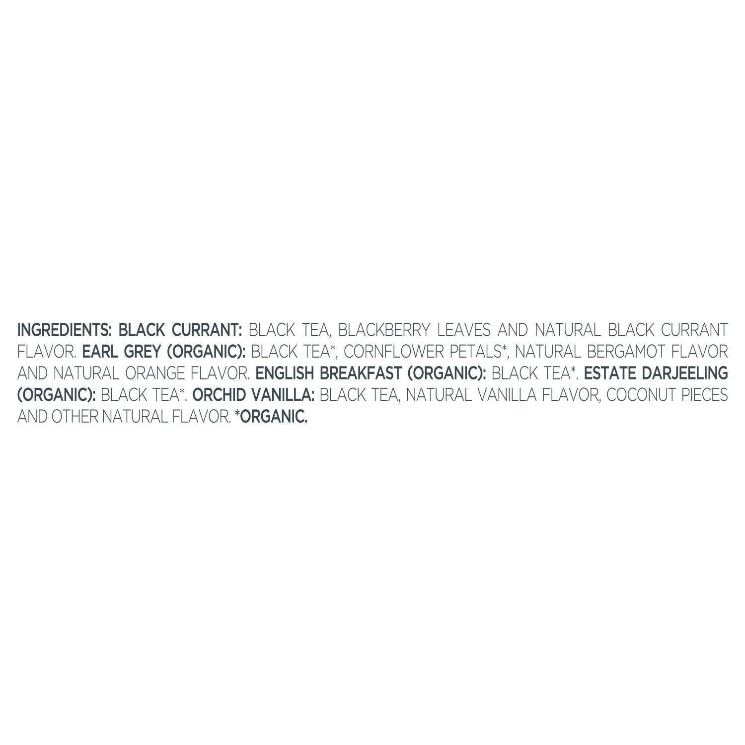- BLACK TEA ASSORTMENT with five varieties of our most popular black tea blends - Earl Grey, English Breakfast, Estate Darjeeling, Black Currant, Orchid Vanilla