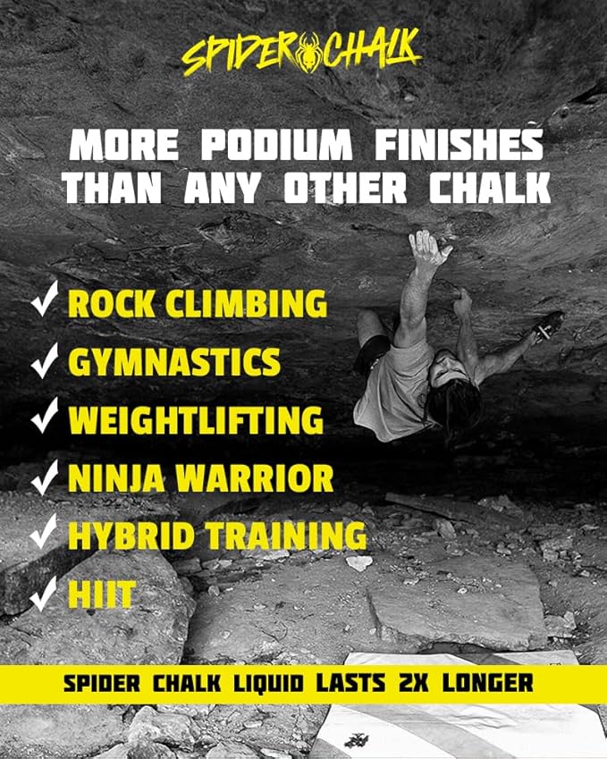 - Versatile Use: Perfect for hardcore workouts, Spider Chalk’s Black Widow liquid gym chalk is ideal for climbing, weightlifting, and powerlifting, providing the perfect balance of adherence and moisture control.