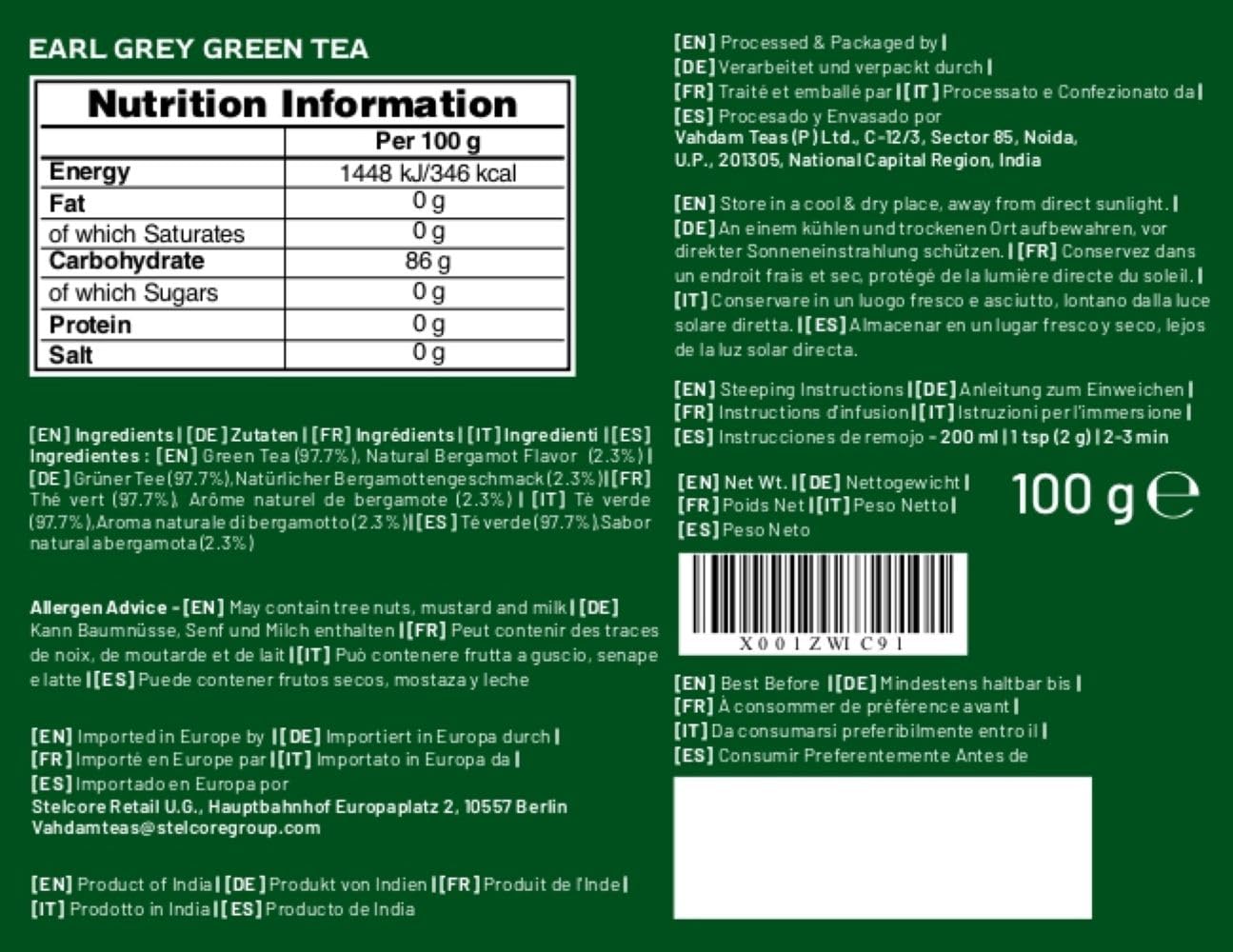 - EARL GREY GREEN TEA - Discover the perfect harmony of flavors in our Earl Grey Green Tea. This blend combines the choicest Green tea with precisely balanced bergamot notes offering a uniquely refreshing experience. With medium caffeine content, it's suitable for any time of day. Enjoy it without milk and relish the precise fusion of flavors in every sip.