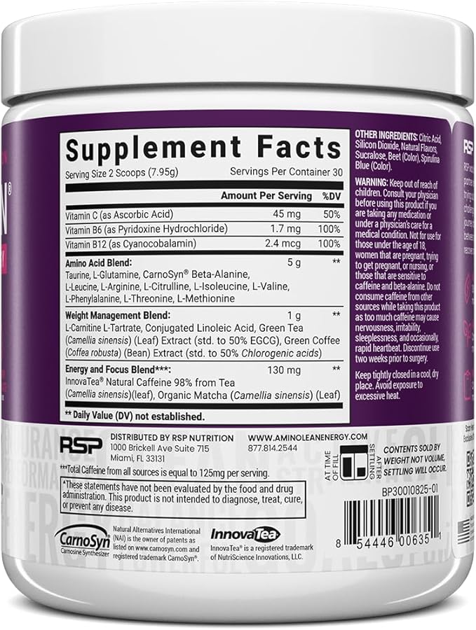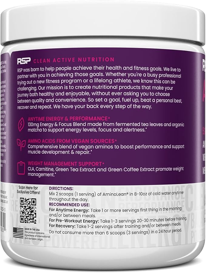 RSP NUTRITION AminoLean Pre Workout Powder, Amino Energy & Weight Management with Vegan BCAA Amino Acids, Natural Caffeine, Preworkout Boost for Men & Women, 30 Serv