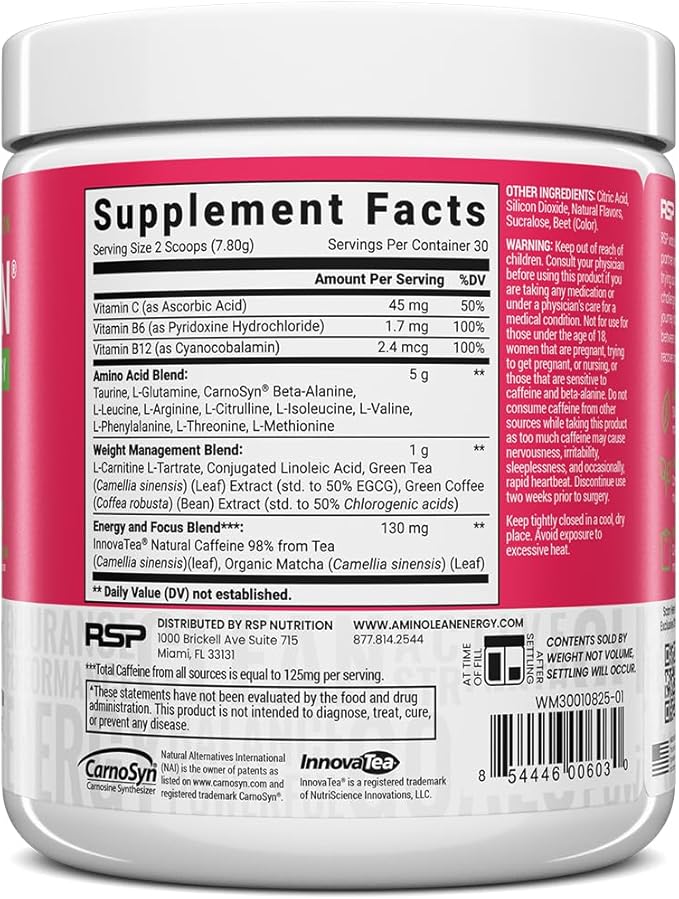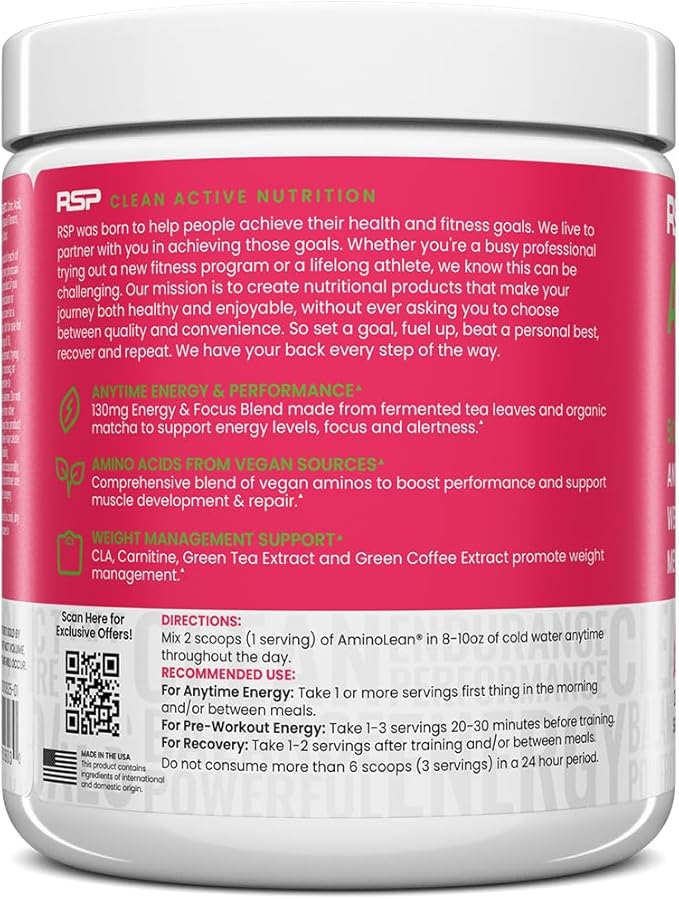 RSP Nutrition AminoLean Pre Workout Powder, Amino Energy & Weight Management with BCAA Amino Acids & Natural Caffeine, Preworkout Boost for Men & Women, 30 Serv