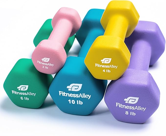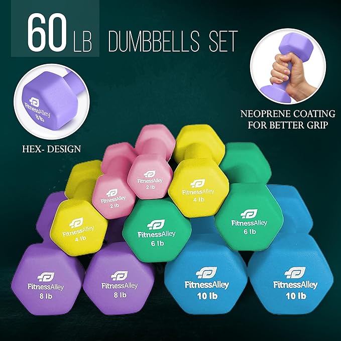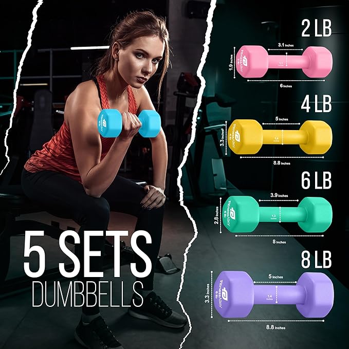 - The box includes 5 dumbbells pairs (2LB, 4LB, 6LB, 8LB and 10LB) with various colors. is of superior quality along with neoprene gripping that allows lifting of heavyweights simpler and easier