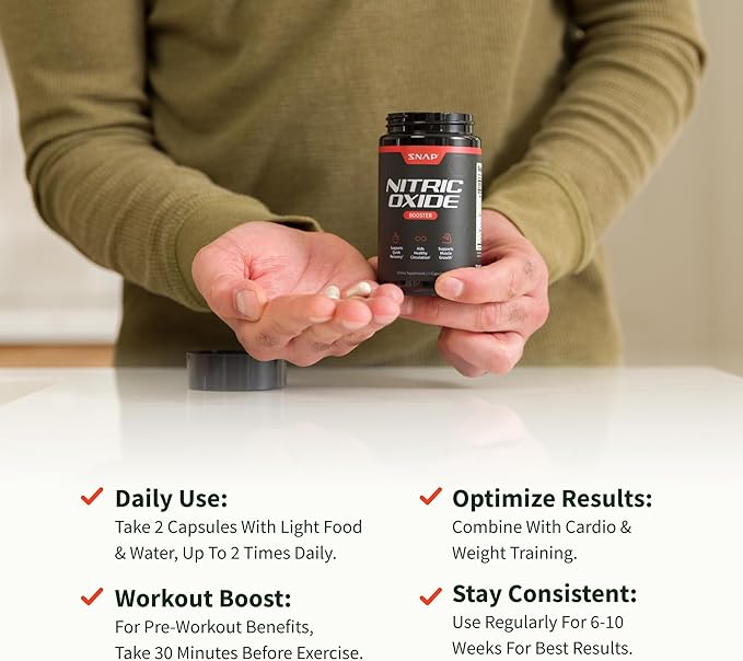 Snap Supplements Nitric Oxide Booster Supplement with L Arginine and L Citrulline Essential Amino Acids and Ginseng Root, Energy, Heart Health, Muscle Growth & Circulation Support, 60 Capsules