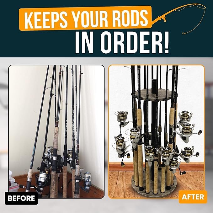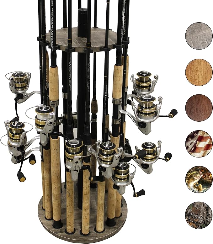 Rush Creek Creations | Round Spinning Fishing Rod Holder for 16 Freshwater Fishing Poles, Fishing Gear, and Fishing Accessories | Fishing Rod Rack with 16 Fishing Rod Clips for Garage Organization