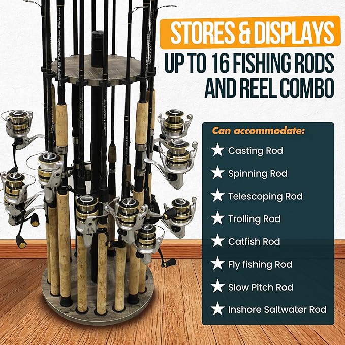 - FISHING ROD HOLDER: This spinning fishing gear holder can hold up to 16 freshwater fishing rods, poles, and reels that are neatly organized and secured in place; ideal for your garage organization, shed, boats - and any of your fishing adventures.