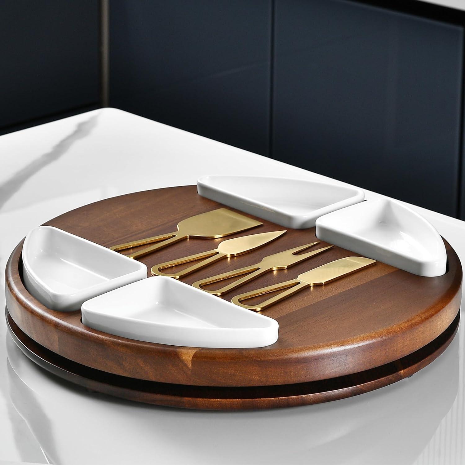 Shanik Upgraded Lazy Susan Cheese Cutting Board Set - Round Acacia Charcuterie Board With 4 Ceramic Bowls - Wedding Gifts - Cheese Serving Platter - Bridal Shower