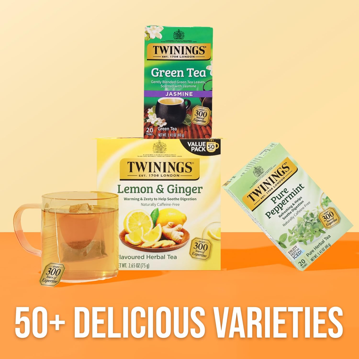 Twinings Lemon & Ginger Herbal Tea Individually Wrapped Bags, 50 Count (Pack of 6), Tangy Lemon & Spicy Ginger, Naturally Caffeine-Free, Enjoy Hot or Iced, 300 Teabags