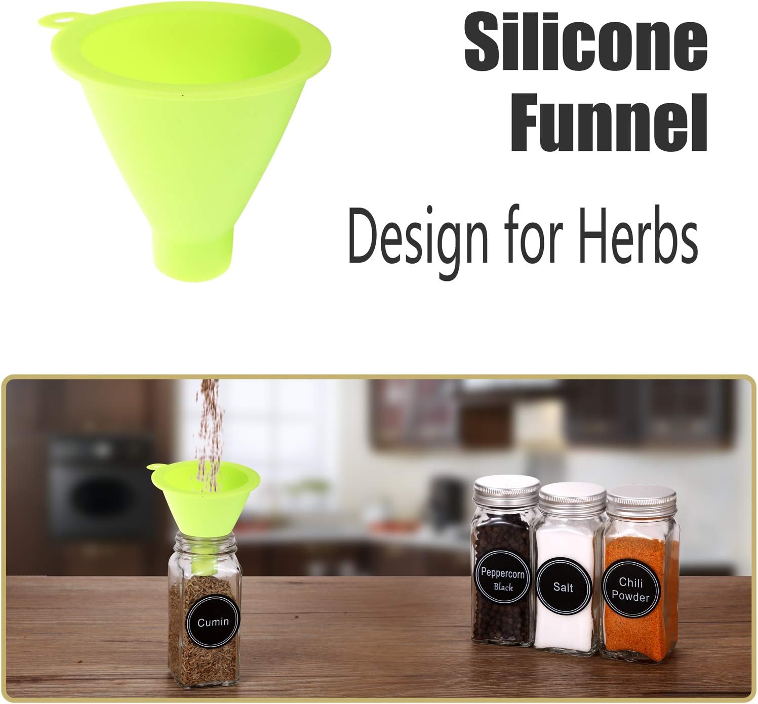 - 36 Glass Spice Jars with Labels Set : 36 x empty glass spice jars, 36 x plastic inner shaker lids, 36 x metal caps, 2 types of waterproof spice labels, 1x silicone funnel, 1x chalk marker. Each empty spice jar dimensions about 1.8"W x H 4.1"H, 4 fluid oz capacity.