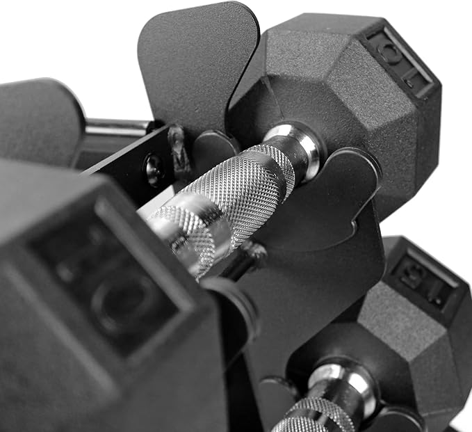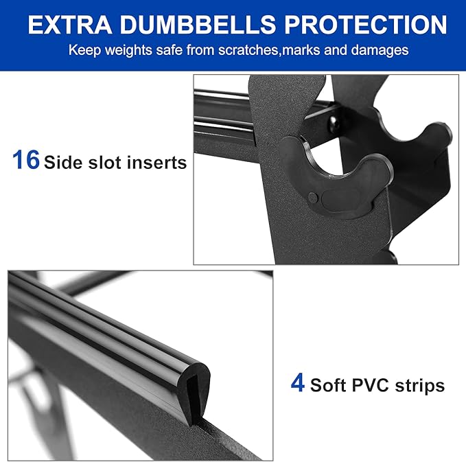 - PROTECTIVE INSERTS FOR CHROME DUMBBELL HANDLES: 2 Vertical side slots protect your dumbbell handles with durable PVC inserts. The 2 middle horizontal tiers is equipped with odorless silicone bars that don’t just protect your dumbbell handles from damage, but also prevent your fingers injuries.