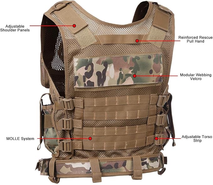- Tactical vests are mounted on hard nylon mesh material for improved ventilation, and the mesh system helps release moisture and heat