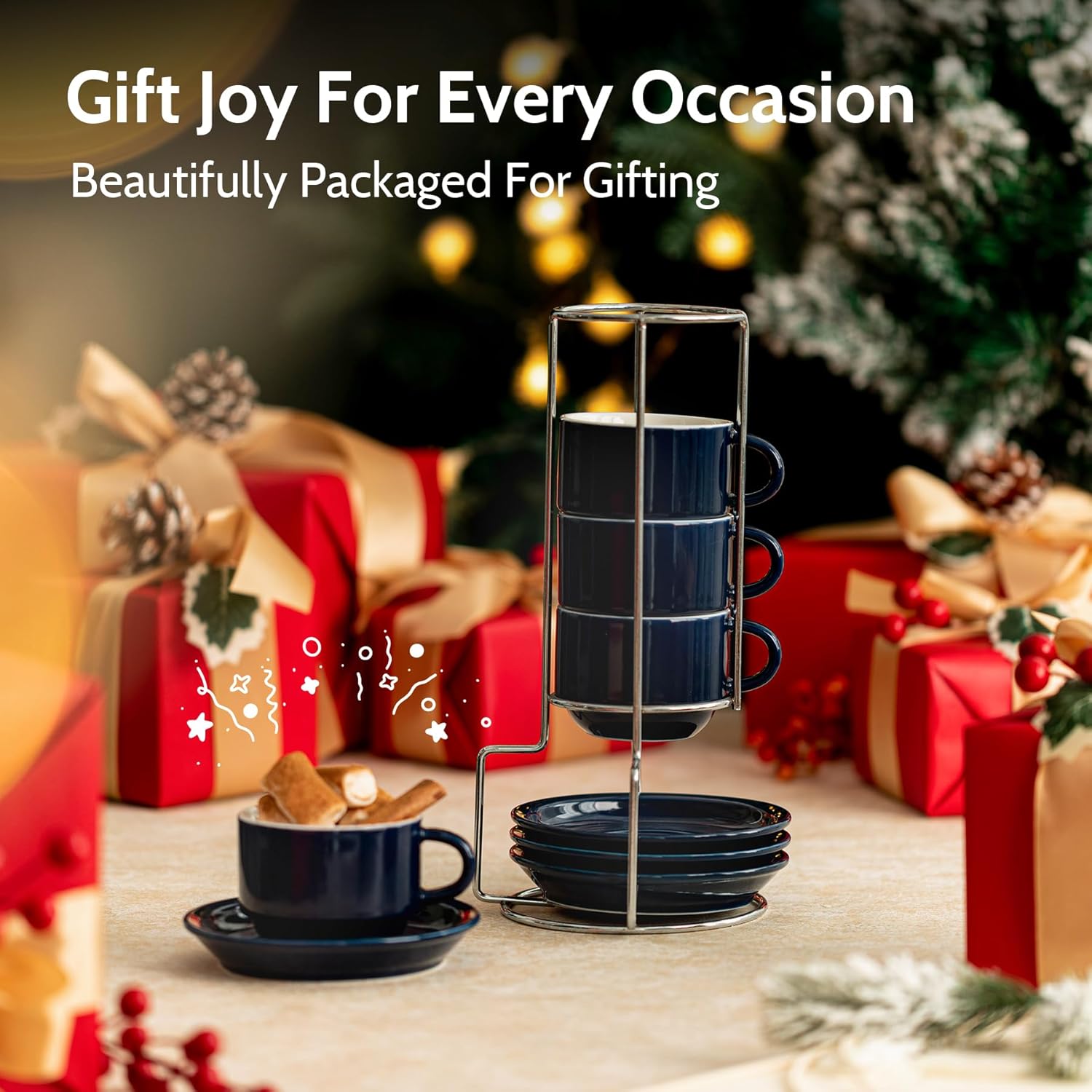 Sweese 8 Ounce Porcelain Stackable Cappuccino Cups with Saucers and Metal Stand - for Specialty Coffee Drinks, Cappuccino, Latte, Americano and Tea - Set of 4, Navy