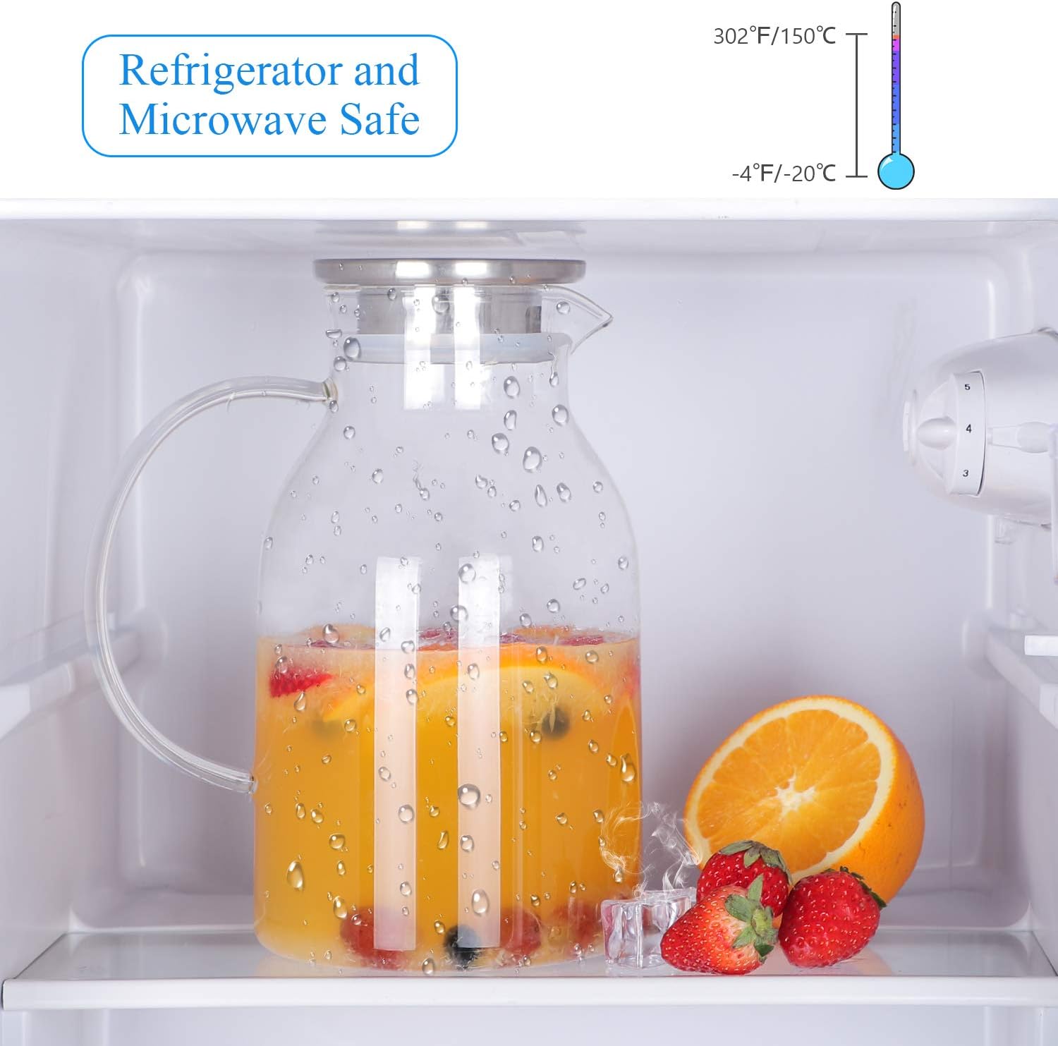 - Temperature safe for cold or hot: this glass water pitcher withstands temperature is -4℉ to 302℉. It’s stovetop safe and well-known for its low coefficients and high thermal resistance, thus safe for gas or electric stove use. Can not be used on induction cooktop. You can pour boiling water or ice water into this pitcher safely.