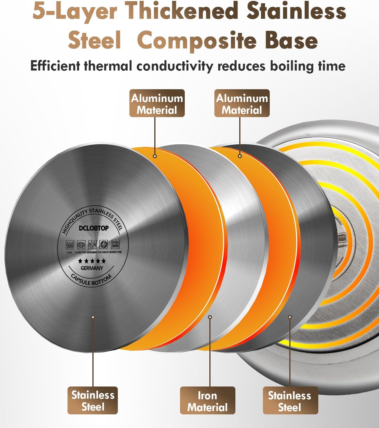 - BOILS WATER IN NO TIME - Unlike many lower quality, cheap, lightweight tea kettles that use just one or two layers, the DCLOBTOP’ tea kettle is made using 5 layers of 18/8 Culinary Grade Stainless Steel, even heat transfer with its aluminum formed capsule bottom that heats up quickly. Less waiting and a more efficient tea or coffee brewing experience for you!