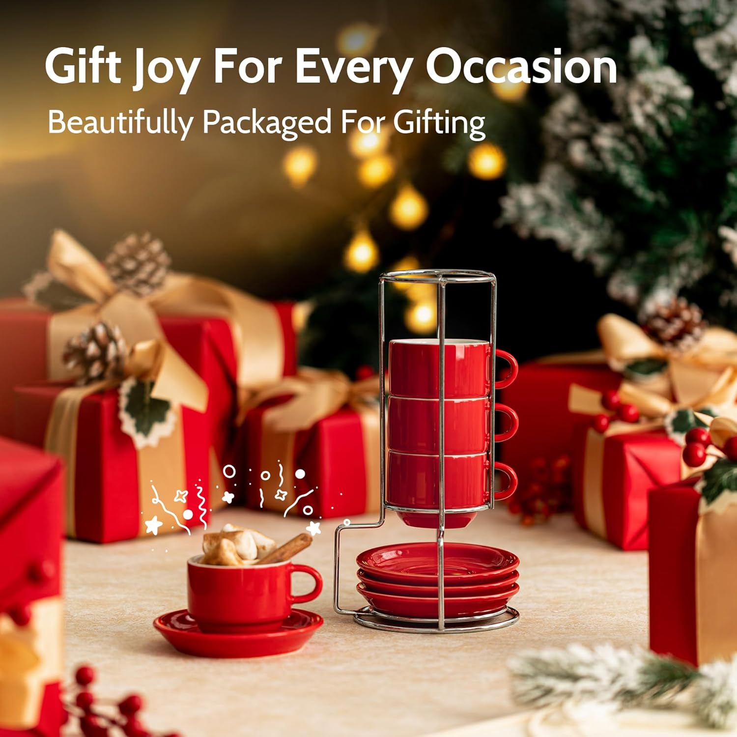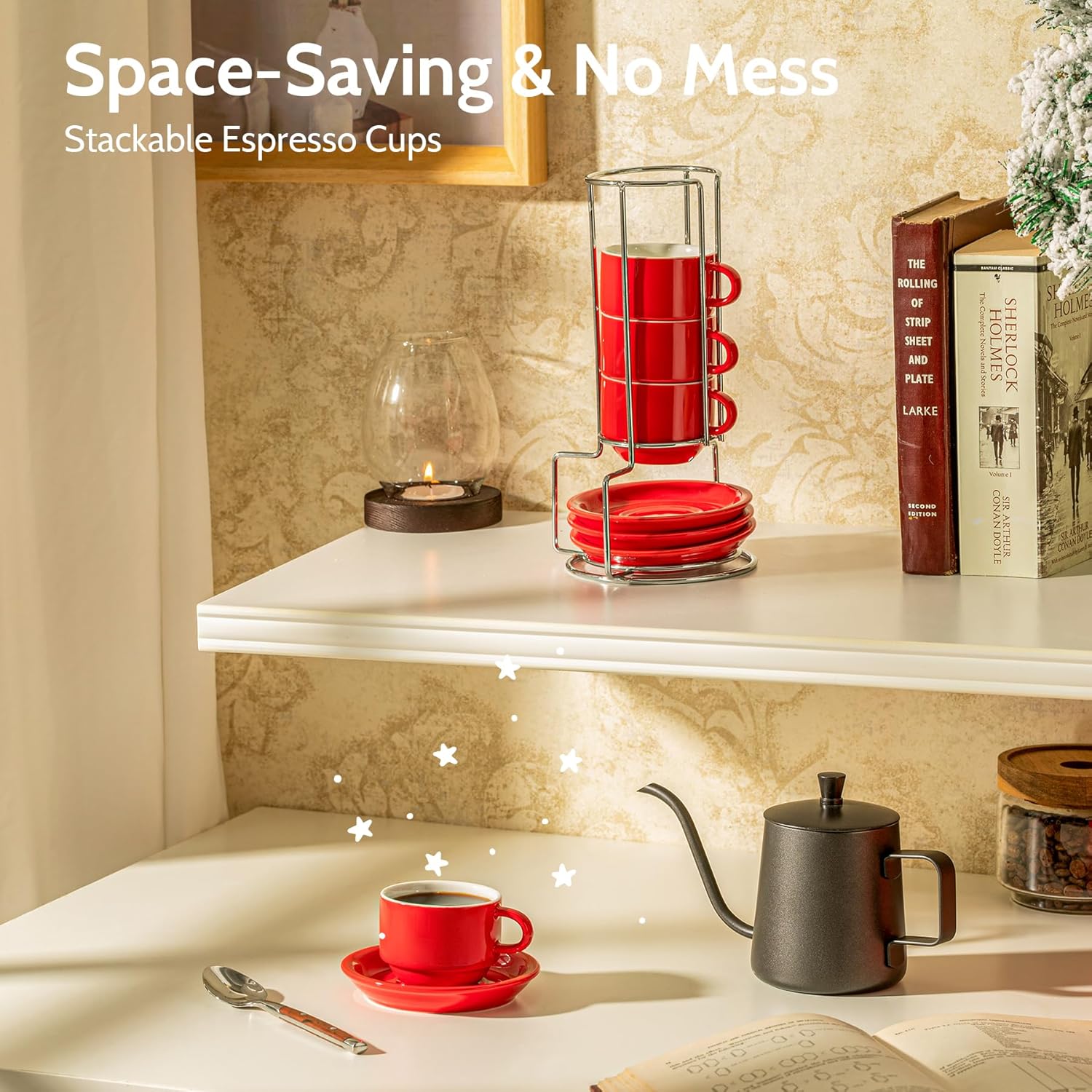 Sweese 2.5 Ounce Porcelain Stackable Espresso Cups with Saucers and Metal Stand Set of 4, Red