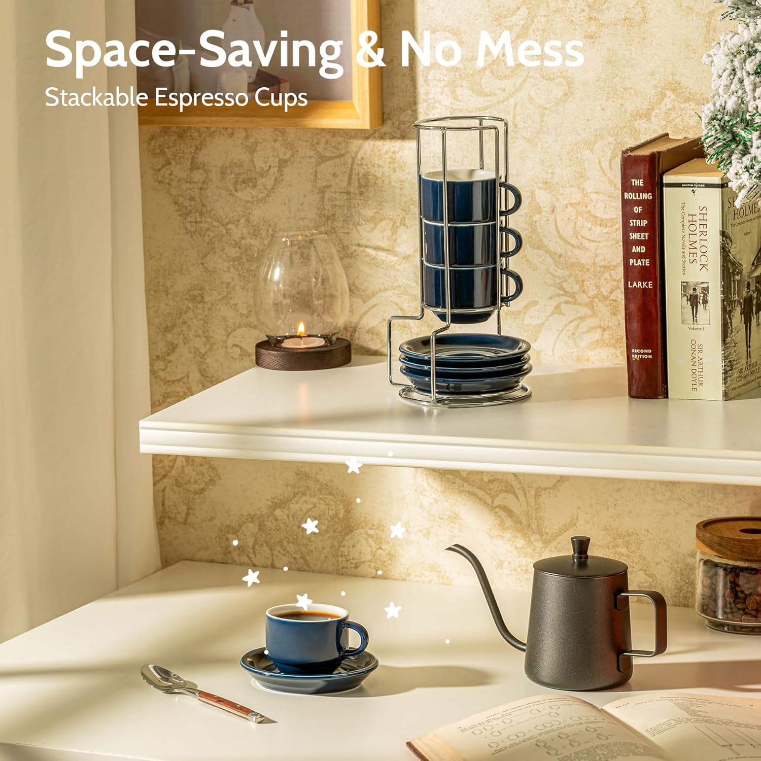 - REDEFINING CONVENIENCE IN EVERY CORNER: Transform your living space with Space-Saving & No Mess perfection. Our innovative stacking rack design keeps your cup set together, occupying just the space of one saucer. Say goodbye to clutter – even the tiniest nook becomes tidy with this compact solution, ensuring your coffee corner remains pristine and mess-free. Enjoy the simplicity of organized living.