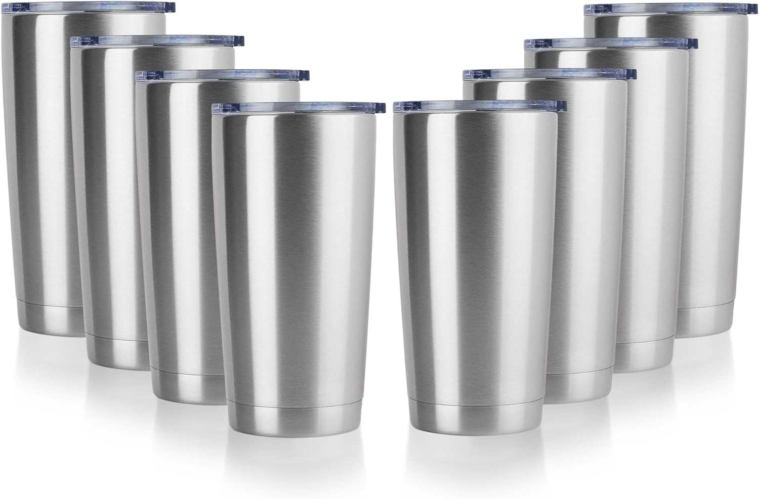 DOMICARE 20oz Stainless Steel Tumbler Bulk with Lid, Double Wall Vacuum Insulated Travel Mug, Powder Coated Coffee Cup, Stainless Steel, 8 Pack