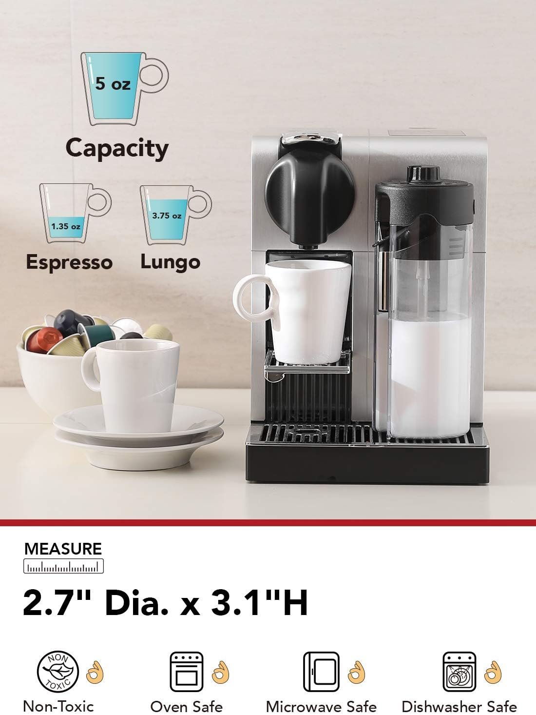- 5 oz for Espresso: Savor the rich, bold flavors of Italian espresso in our specially designed 5 oz espresso cups; With a diameter of 2.7 inches and a height of 3.1 inches, they are the perfect size for enjoying a double shots of espresso or lungo