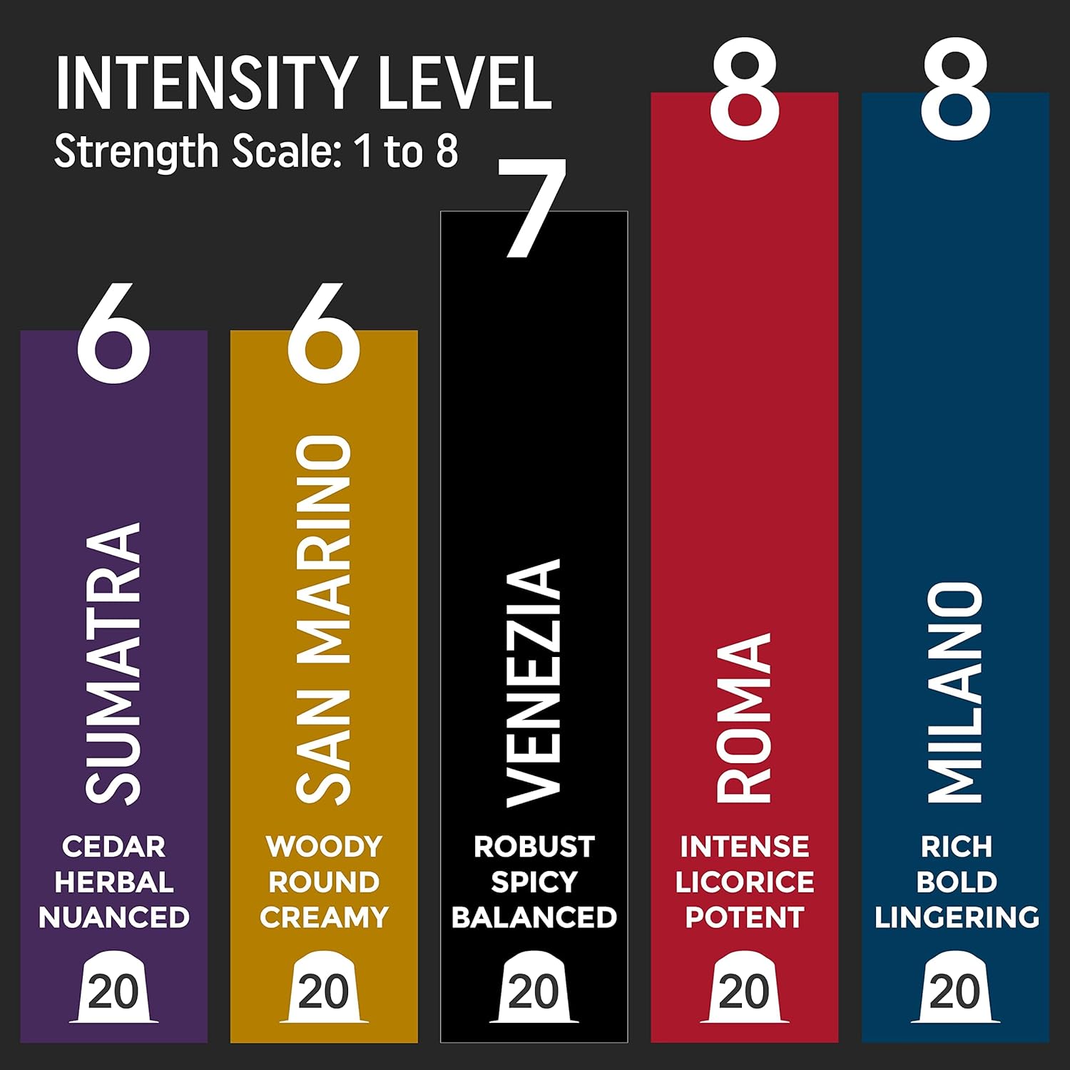 Strong Espresso Variety Pack for Nespresso | 100 Bold Aluminum Pods| 5 Intense Italian Flavors | 100% Nespresso Compatible Pods