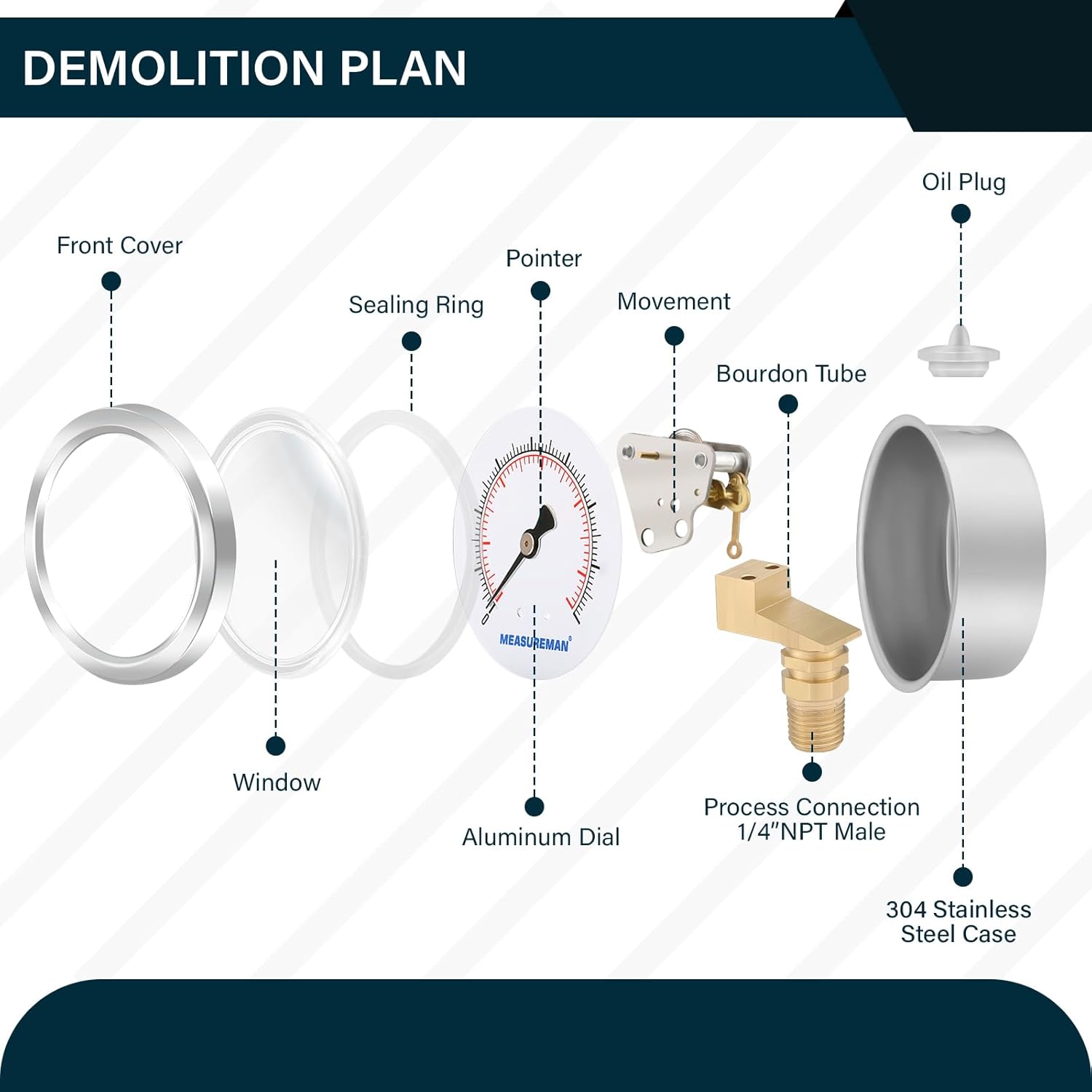 MEASUREMAN 2-1/2" Dial Size, Glycerin Filled Pressure Gauge, 0-160psi/kpa, 304 Stainless Steel Case, 1/4" NPT Center Back Mount