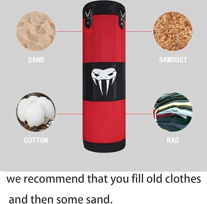 - Unfilled hanging punching bag can be filled with old clothes, wood chips, sand, cotton and other waste fabrics. In order to increase the use time of heavy bag, we recommend that you fill old clothes first and then some sand.