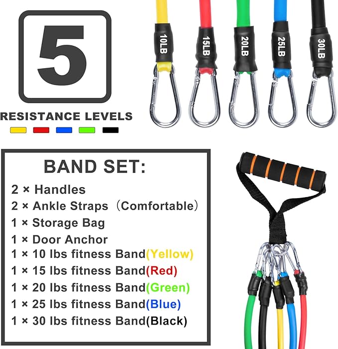 - 【Different Color】:Yellow (10 lbs), Red (15 lbs), Green (20 lbs), Blue (25 lbs), Black (30 lbs). All exercise bands can be used alone or stacked in any combination to a maximum equivalent of 100 lbs.