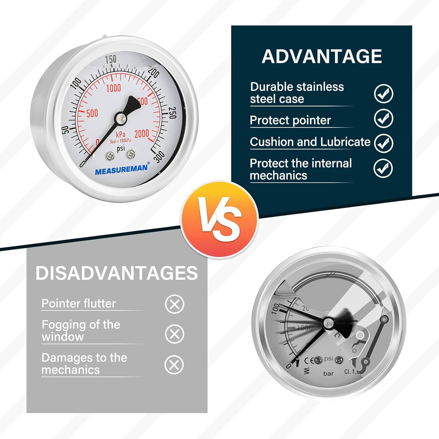 MEASUREMAN 2-1/2 inch Dial Size, Liquid Filled Pressure Gauge, 0-300psi/2000kpa, 304 Stainless Steel Case, 1/4 inch NPT Back Mount